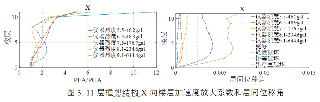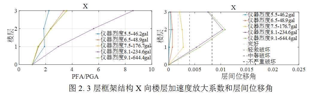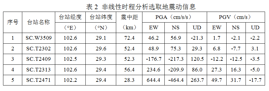 為評(píng)估結(jié)構(gòu)在此次地震動(dòng)的破壞水平,選取了實(shí)際記錄到的儀器烈度對(duì)應(yīng)的5組強(qiáng)震記錄,開展了針對(duì)當(dāng)?shù)乜拐鹪O(shè)防烈度為8度0.2g的5棟典型鋼筋混凝土結(jié)構(gòu)房屋的非線性動(dòng)力響應(yīng)時(shí)程分析。5棟結(jié)構(gòu)包括1棟框架、2棟框剪及2棟剪力墻,結(jié)構(gòu)基本周期從小到大分別是0.47s,0.78s,0.84s,1.5s和2.5s。分析主要給出了對(duì)結(jié)構(gòu)安全和建筑內(nèi)人員體感影響明顯的層間相對(duì)位移和樓層加速度響應(yīng)結(jié)果。表2為選取的地震動(dòng)記錄相關(guān)信息。圖1為選取的5棟結(jié)構(gòu)的有限元模型示意圖,圖2至圖6為五棟結(jié)構(gòu)的初步分析結(jié)果。