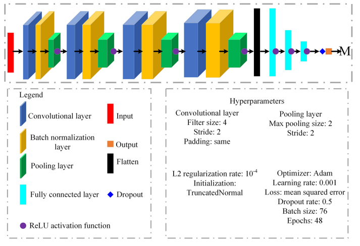 (1)人工智能震級估算:采用基于川滇數據遷移學習后的人工智能DCNN-M模型進行實時震級估算,目前該模型已在福建局、四川局在線運行。DCNN-M模型使用從P波到達后記錄的3s地震數據中提取的12個參數作為輸入,并且該模型由四個卷積層、四個池化層、四個Batch normalization層、三個全連接層、Adam優化器和一個輸出層組成。圖2展示了DCNN-M模型的網絡架構。