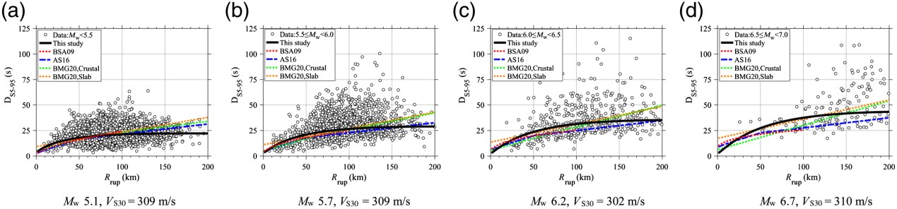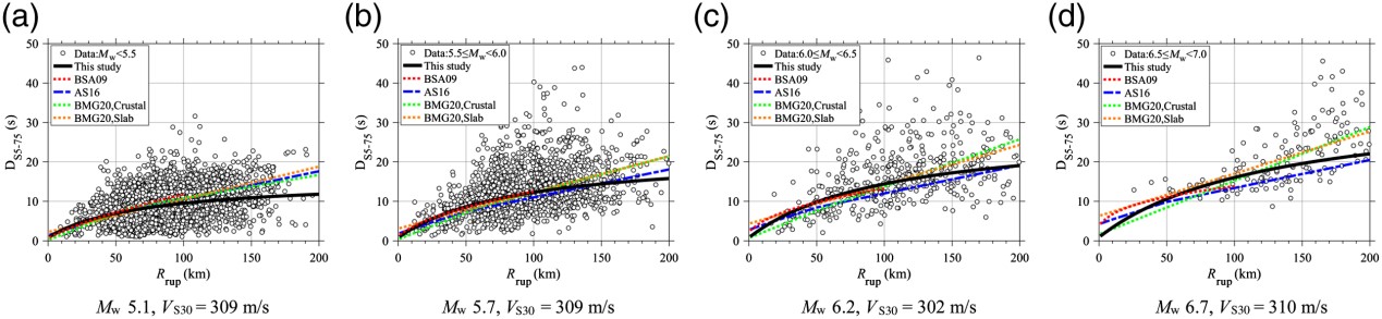 發(fā)布時(shí)間: 2023-04-11 點(diǎn)擊數(shù)量:59123)當(dāng)斷層距大于100 km時(shí),持時(shí)的SVR-GMMs預(yù)測結(jié)果小于BMG20(圖4)。當(dāng)M<5.5時(shí),顯著持時(shí)隨距離衰減存在明顯的遠(yuǎn)場飽和現(xiàn)象,顯著持時(shí)的飽和距離為100 km。本文開發(fā)的SVR-GMMs有效地捕捉到了顯著持時(shí)存在的這一區(qū)域衰減特征。